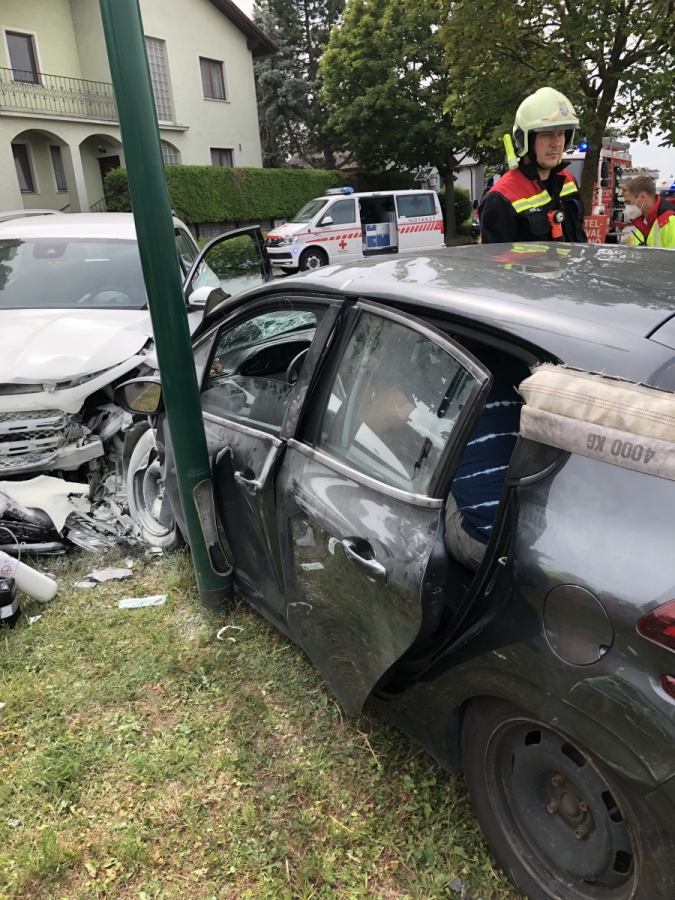 Am Einsatzort angekommen, fanden wir zwei PKWs vor, welche aus bisher unbekannter Ursache frontal zusammen gestoßen waren.