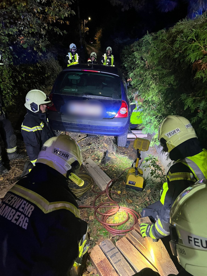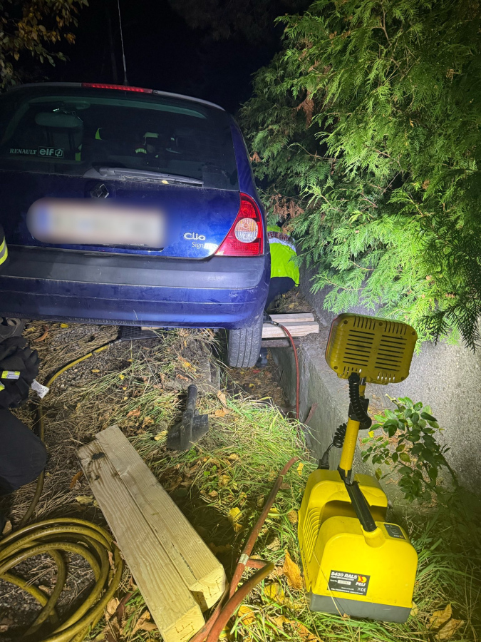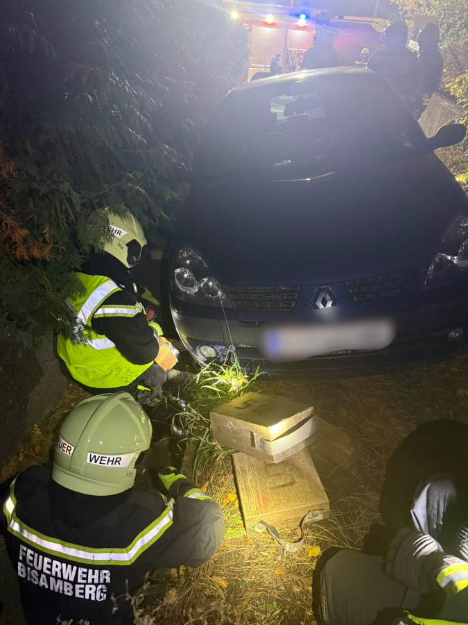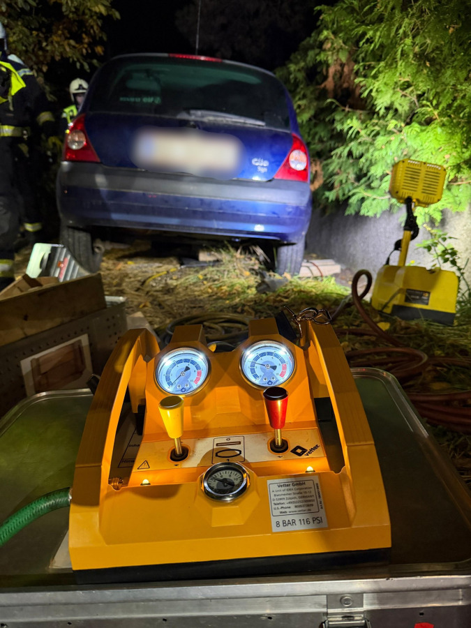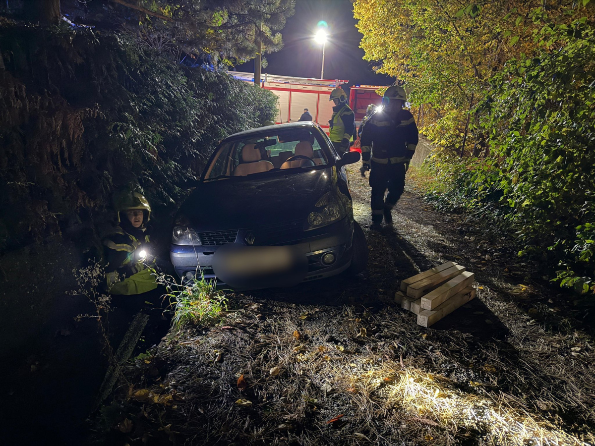 Die lenkende Person übersah beim Rangieren den Kanalgraben am seitlichen Straßenrand und blieb mit dem Pkw darin stecken. Das Fahrzeug wurde zunächst gesichert und unterbaut. Danach wurde es mit Hebekissen angehoben und mit 10 / 10er Staffeln eine Rampe gebaut. Dadurch konnte das Fahrzeug dann sicher rausgerollt werden.