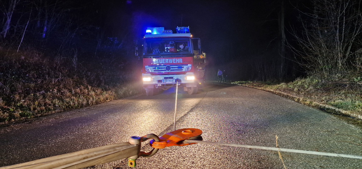 Um ein weiteres Abrutschen in den Wald zu Verhindern, würde das Fahrzeug mittels Seilwinde des Rüstlöschfahrzeugs zurück auf die Straße gezogen.