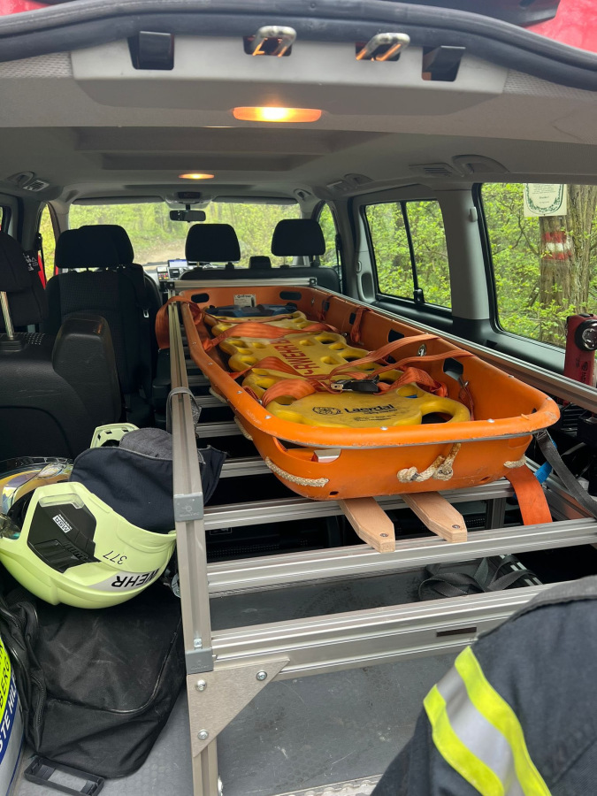 Nach dem wir am Parkplatz auf der Gamshöhe den Rettungsdienst bei uns im Kommandofahrzeug mit aufgenommen habe, sind wir zusammen mit unserem Mannschaftstransportfahrzeug, ebenso geländegängig und mit einer Tragevorrichtung ausgestattet, zum Verunfallten aufgebrochen.